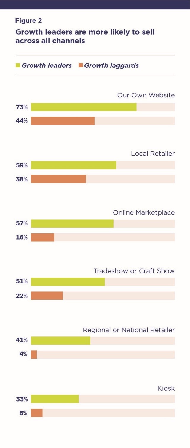 Online marketplaces are also an essential channel, with revenue on these platforms expected to more than double to $40.1 billion globally by 2022, according to another study by Juniper Research. These marketplaces not only expose small brands to potentially millions of new customers, they ease the burden of back-end operations such as billing, fulfillment, and returns. The survey supports the importance of this channel: 97 percent of those using an online marketplace such as Amazon or eBay have recorded revenue growth in the past 12 months.